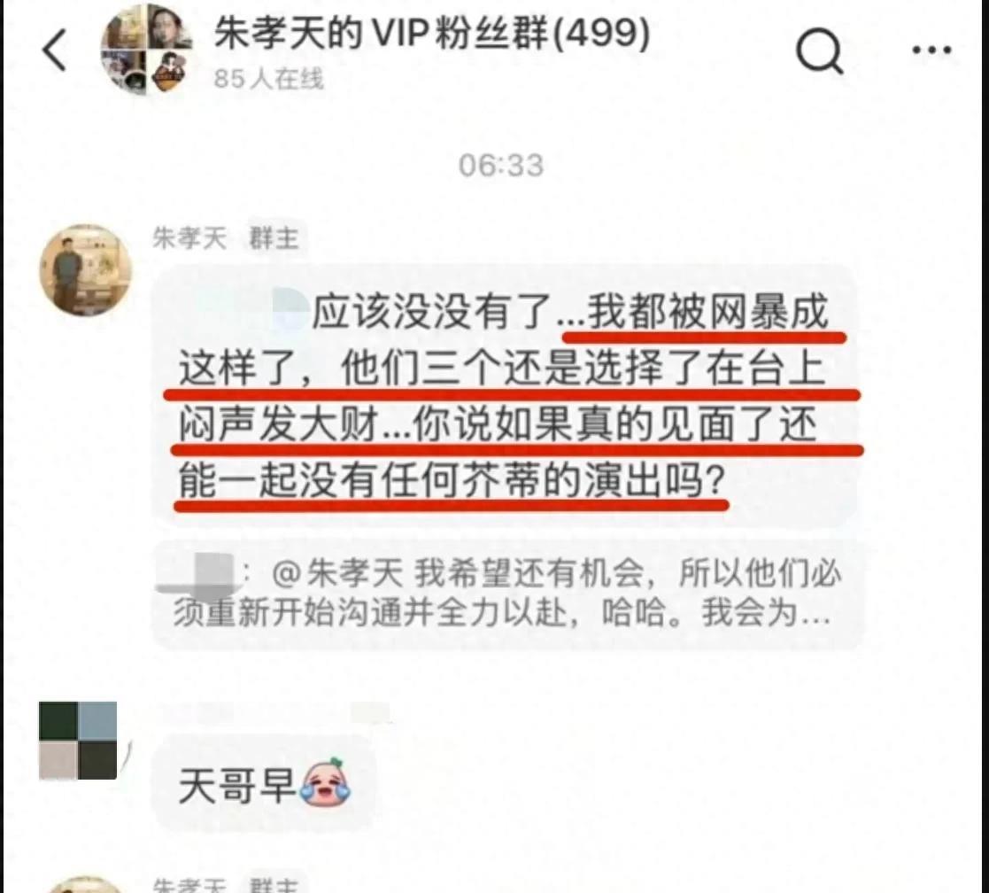 朱孝天彻底破防在自己的粉丝群里持续输出爆猛料,直接炮轰F3不顾自己被网暴,他们三个还是选择上台和阿信一起开演唱会,闷声挣大钱。并且否认再次合体的可能性,因为这件事情已经让彼此心生芥蒂,更不可能若无其事地同台演出了,并且称自己是演不出那种感觉了。