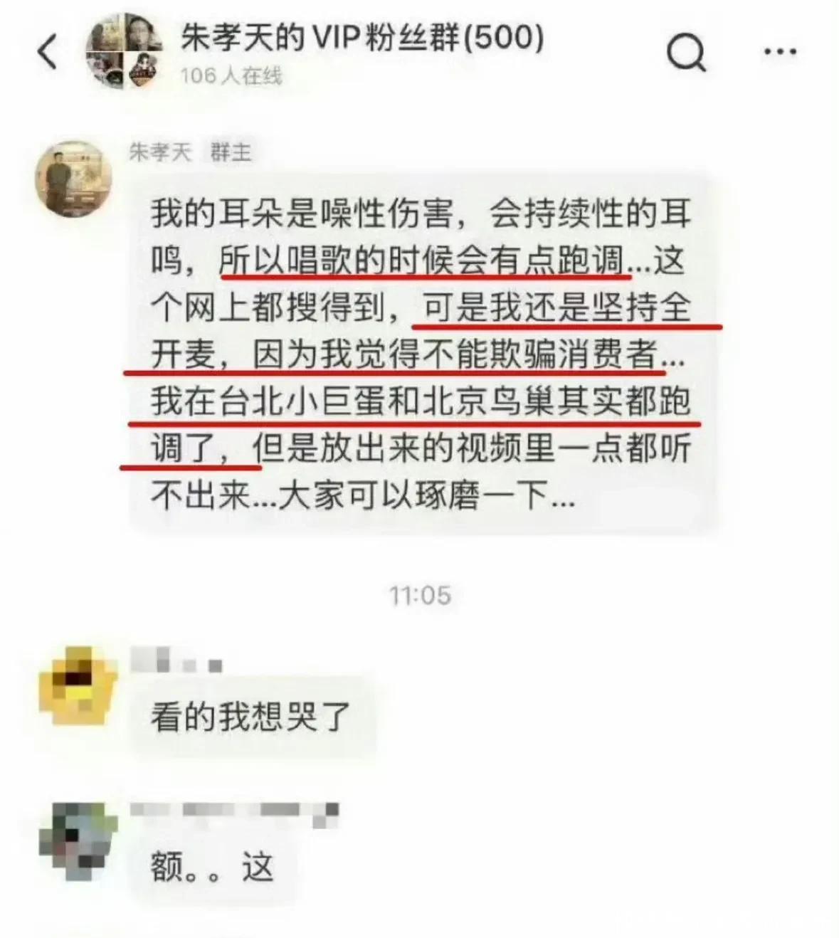 朱孝天还自爆自己的耳朵是噪音伤害,会持续性的耳鸣,所以唱歌的时候会跑调,但是自己依然坚持全开麦演唱,因为不想欺骗消费者,但在台北和北京的两场演出都跑调了,音频却听不出来,疑似直接明涵五月天的阿信跑调。